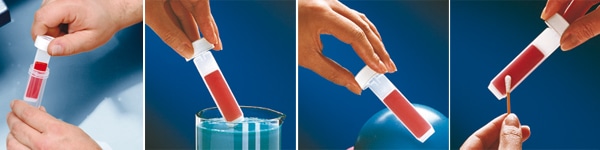 Odkręcić fiolkę i wyjąć nie dotykając pożywki. W przypadku cieczy o niskiej gęstości należy zanurzyć płytkę na 5 – 10 sekund, aby pożywka została dokładnie zwilżona z obu stron. W przypadku kremów, żeli i innych gęstych i lepkich preparatów użyć sterylnego gazika. Gazikiem nabieramy preparat i delikatnie rozprowadzamy bardzo cienką warstwą na całej powierzchni pożywki, z obu stron płytki. W przypadku produktów twardych, na przykład mydła, należy kolejno lekko docisnąć obie strony płytki do produktu, przytrzymując przez 5 – 10 sekund.